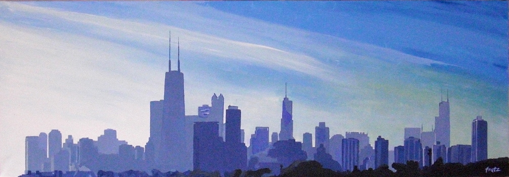 Painting: Chicago skyline, 50 x 120, acrylic on canvas, hanging without frame, canvas painting, art